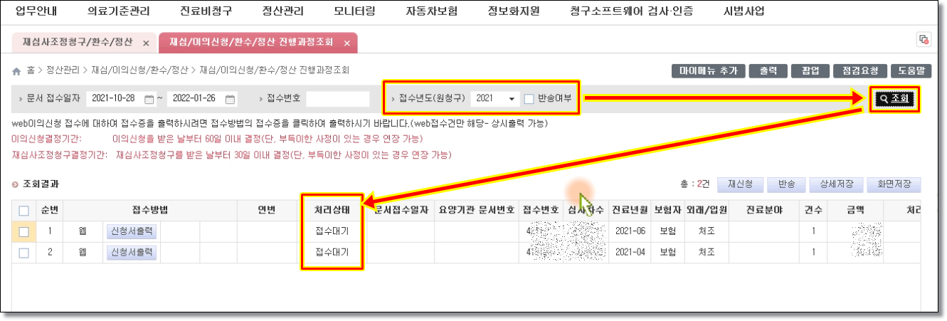 ⑥-2. '접수년도(원청구)'에서 해당연도를 선택 후 조회하면 처리상태를 보실 수 있습니다.