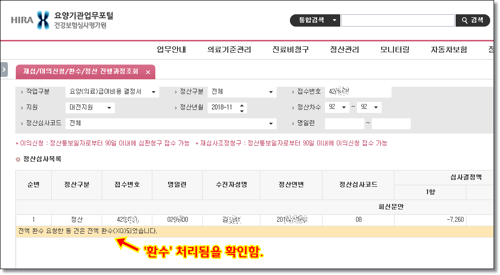 ⑤-3. 환수요청할 기간(해당월이나 접수번호로 조회)을 선택후 조회 → 해당청구건 선택