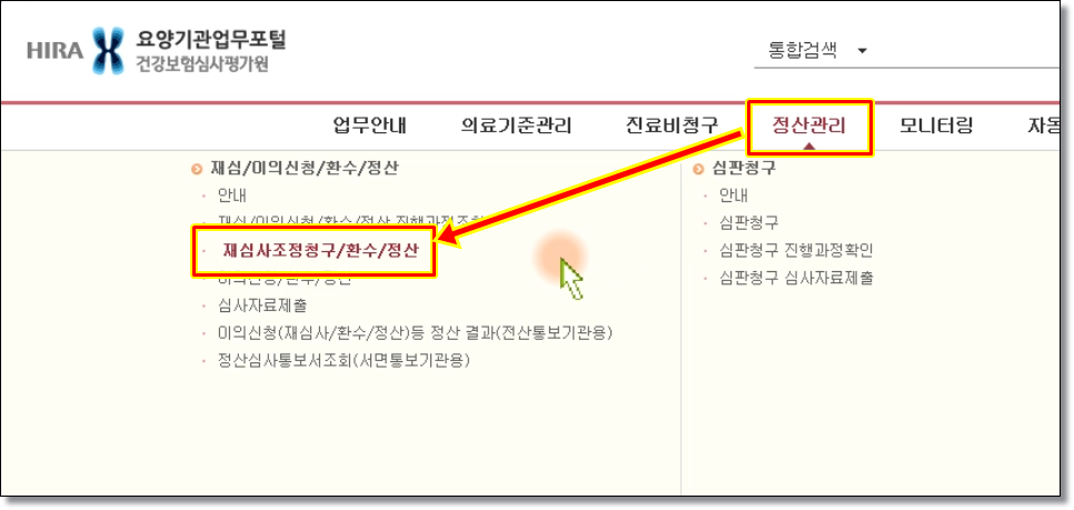 ⑤-2. 정산관리 → 재심사조정청구/환수/정산 버튼을 클릭합니다.