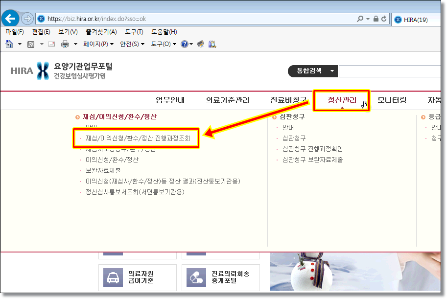 http://biz.hira.or.kr 에 접속 → 공인인증서 로그인 → 정산관리 → 재심/이의신청/환수/정산 진행과정 조회