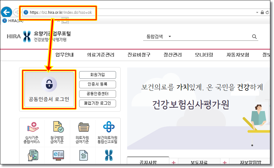 ⑤-1. 인터넷창을 열어 인터넷주소 biz.hira.or.kr 로 접속한 후 공동인증서로그인 을 합니다.