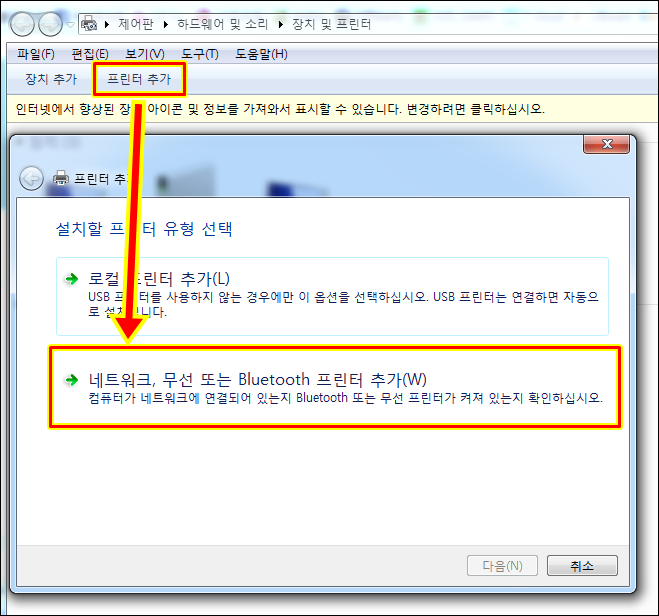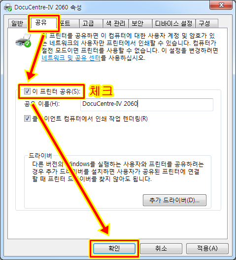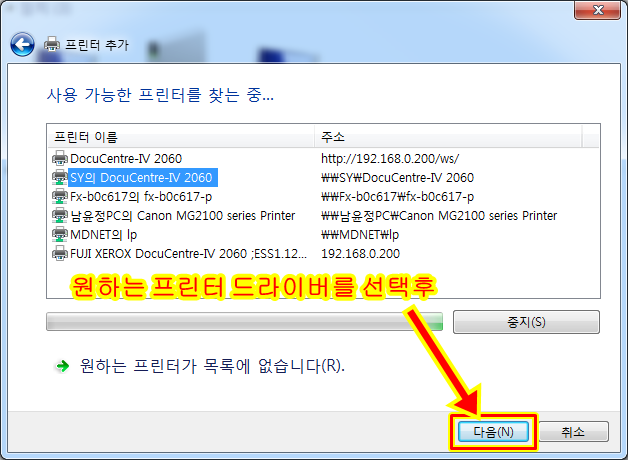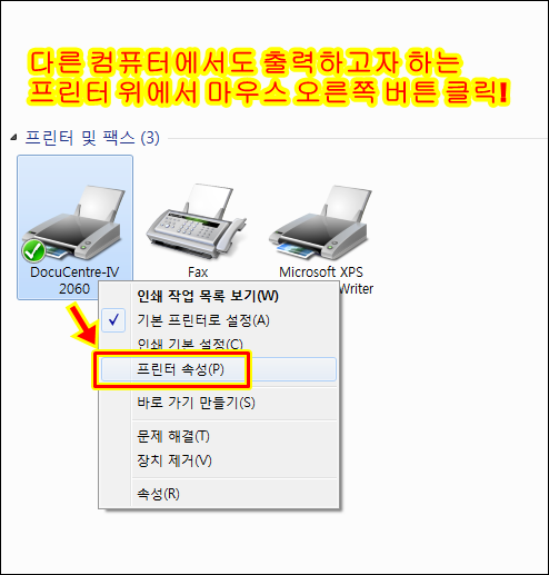공유가 끝나면 다른 컴퓨터(출력이 안되는)에서 네트워크 프린터로 연결해줍니다.