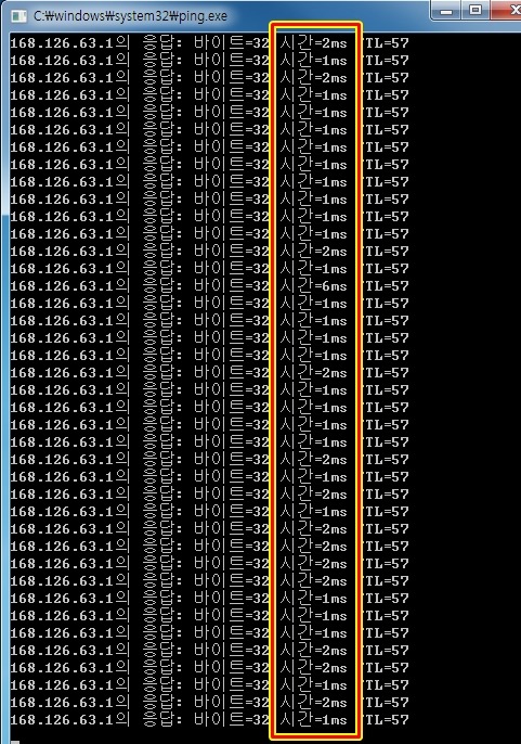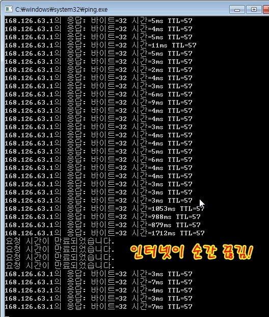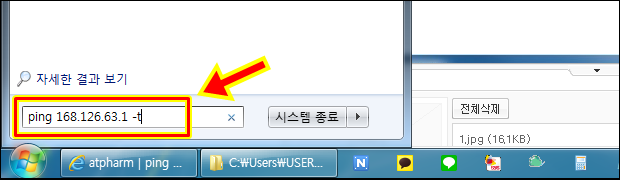 시작 - 바로 위의 칸에 ping 168.126.63.1 -t 를 입력후 엔터 (띄어쓰기 주의)
