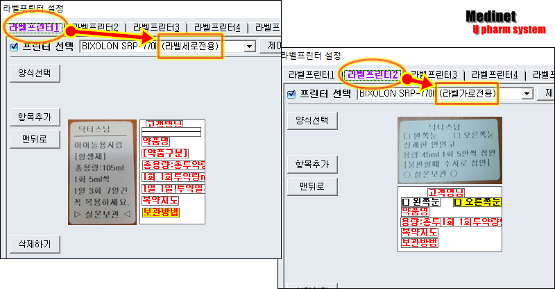 ▼ 유팜의 환경설정(6) - 프로그램설 정 - 라벨 - '라벨프린터 형식 편집'에서 라벨프린터1~5까지 적당한 형식으로 편집합니다.
