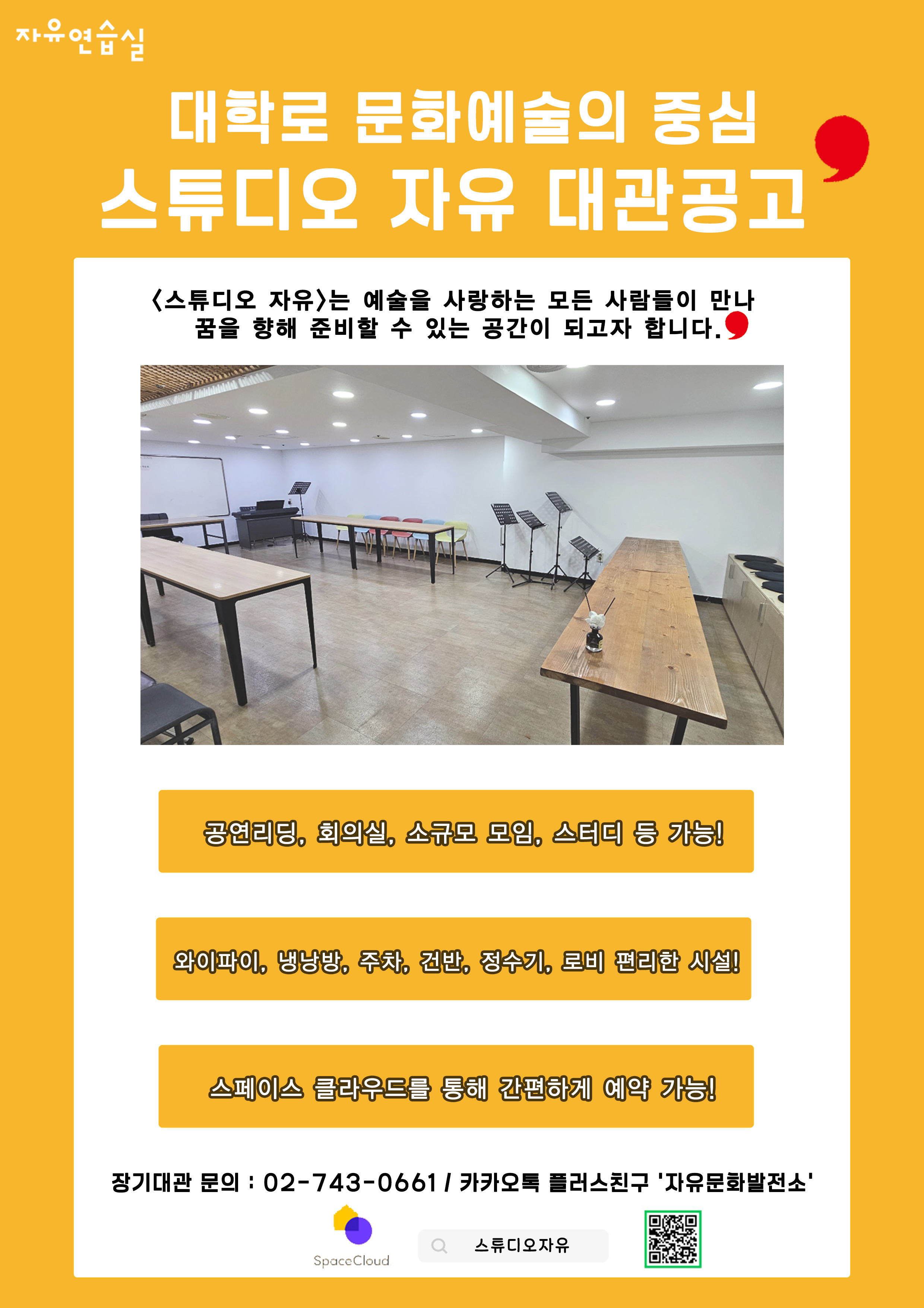 [자유연습실] 스튜디오 자유 / 연습실대여 (혜화역 1번 출구 도보 3분거리) 작성자자유극장|작성시간25.10.29|조회수7 목록 댓글 0 글자크기 작게가 글자크기 크게가 다음검색 현재 게시글 추가 기능 열기 북마크 공유하기 신고 센터로 신고 댓글 댓글 0 댓글쓰기 답글쓰기 댓글 리스트