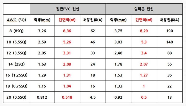 일반 PVC 전선과 실리콘 전선의 허용전류 비교표