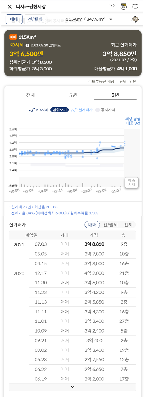 KB 부동산 시세로는 3.65억입니다~~ 최근 3.8억에 거래된 이력이 있고요~
