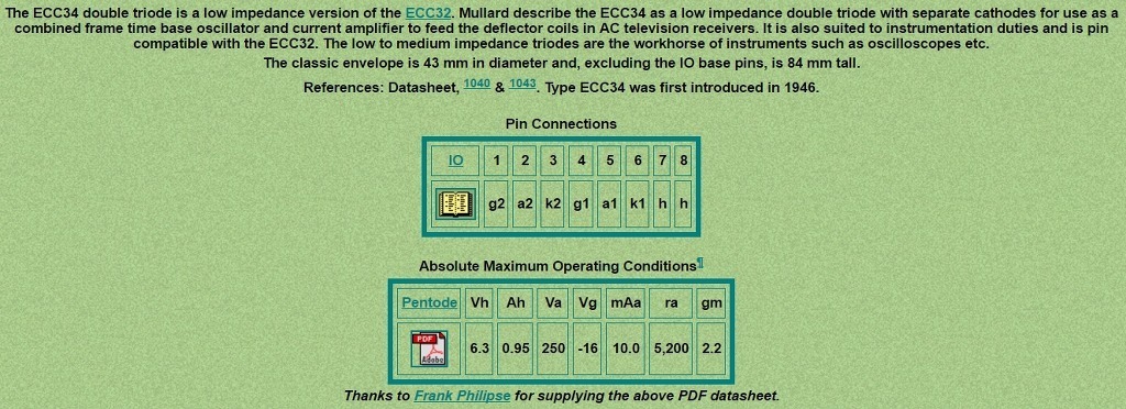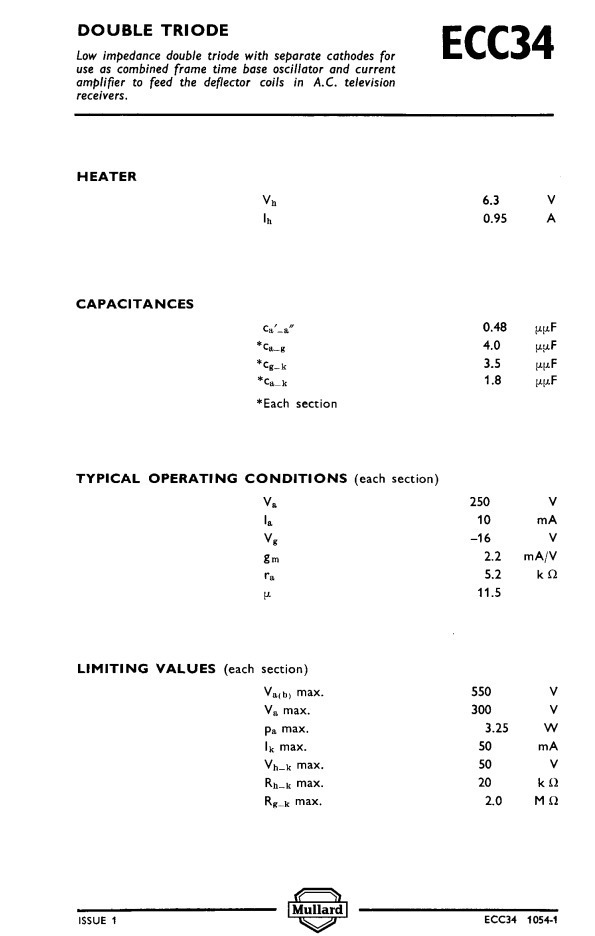 Contemperaneous Mullard publication은 ECC34를 결합 된 프레임 시간축 발진기와 전류 증폭기 및 계측 증폭기로 사용하기 위해 별도의 음극을 갖는 저 임피던스 이중 삼극관이라고 설명합니다.