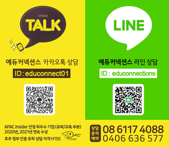 호주 대학교 진학 상담은 '대학교 상담 전문' 에듀커넥션스 유학원으로 문의 주시면 대학 진학시 유념하셔야 하는 상세한 부분들까지 꼼꼼히 살펴 진행하실 수 있도록 안내드리고 있습니다. 대학(원) 진학 상담과 학생비자 신청 대행 서비스까지 모든 서비스는 무료로 제공됩니다.