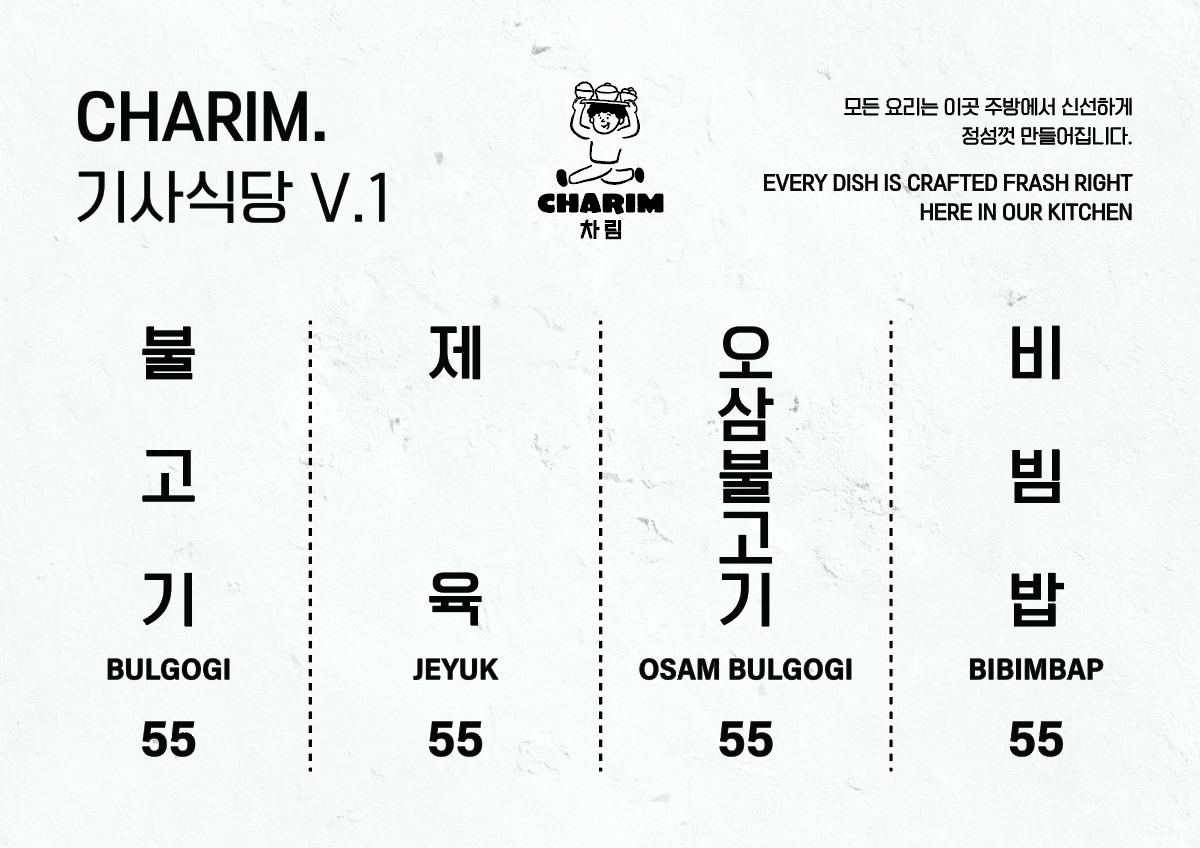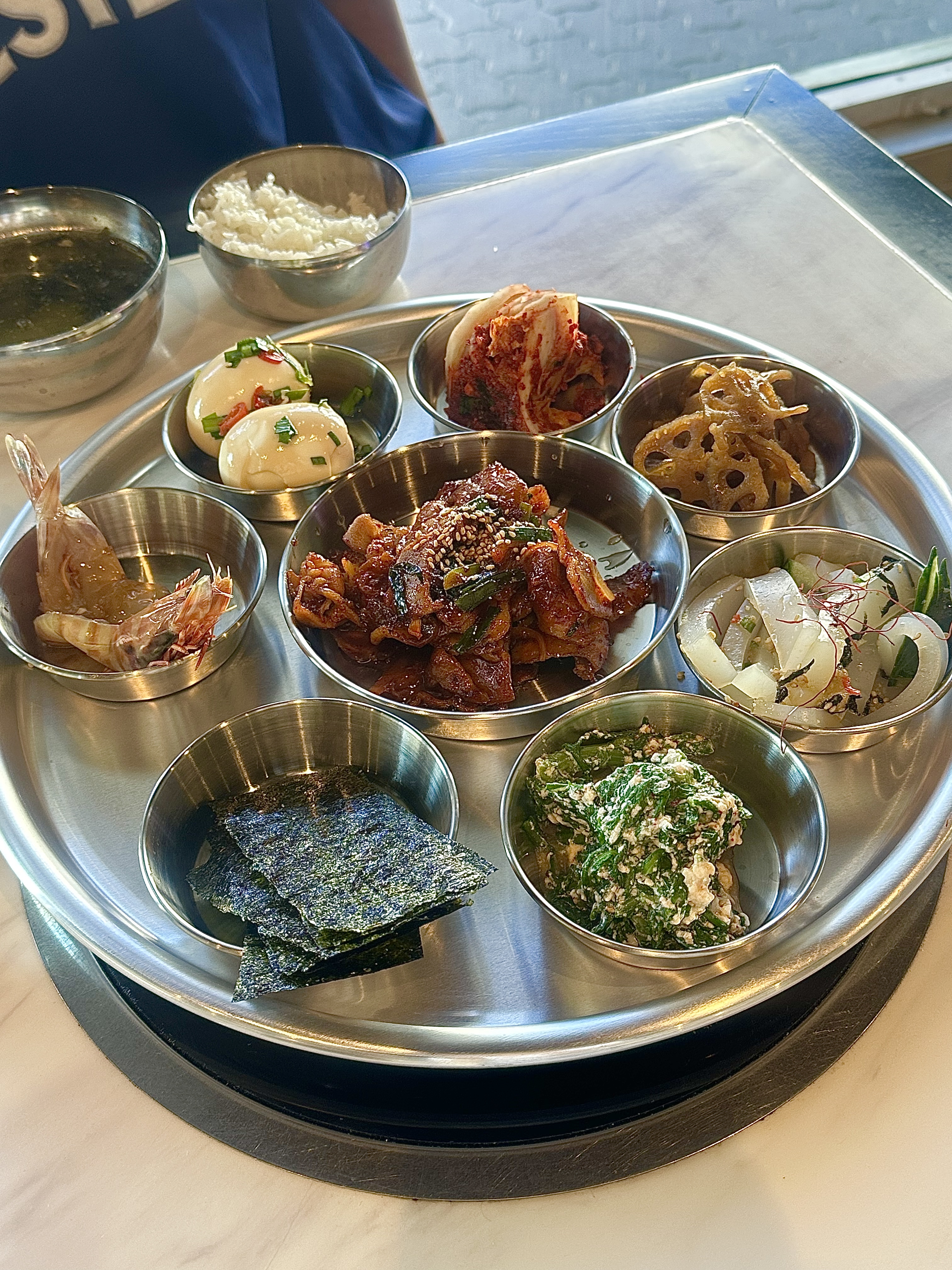 한국의 기사식당을 모티브로, 정갈하게 준비된 7가지 반찬(배추김치, 전류, 계란장, 도토리묵 또는 청포묵, 새우장, 직접 구운 김, 제철 나물)을 메인 요리와 함께 제공합니다.