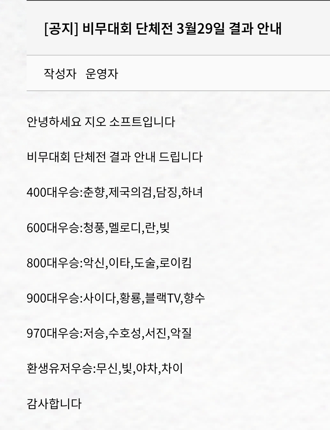 비무결과를 알고싶다. 작성자서영락대리|작성시간26.03.29|조회수658 목록 댓글 5 글자크기 작게가 글자크기 크게가 400~ 환생까지 어디문파가 우승 했나요?구경을 못해서... 정리해 주실분 감사드립니다 다음검색 현재 게시글 추가 기능 열기 북마크 공유하기 신고 센터로 신고 댓글 댓글 5 댓글쓰기 답글쓰기 댓글 리스트 작성자아리까리 | 작성시간 26.03.29 400 화랑600 UDT800 UDT900.970.환생 무명 작성자MHB박진호 | 작성시간 26.03.29 800대 지존 유디티 가치먹음 작성자서영락대리 작성자 본인 여부 작성자 | 작성시간 26.03.29 감사합니다 작성자남바완 | 작성시간 26.03.29 특히 970비무는 유디티애들 손꾸락 -10000강인거 인증함ㅋㅋㅋ조나게못함 ㅠㅠ 답댓글 작성자아리까리 | 작성시간 26.03.29 400대도 하는거보고 놀랐습니다 진심;;; 댓글 전체보기