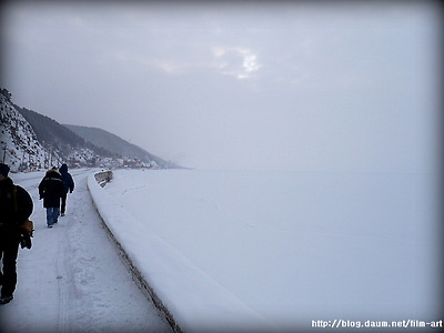 저멀리 얼어붙은 호수위를 걸어가는 두 사람의 모습이 보입니다.