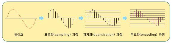 - 신호변환과정 ; 표본화(일정한 단위로 구분하여 표본을 추출)-> 양자화(대표값을 표현하는 과정)-> 부호화(특정규정에 맞게 2진 데이터로 표현), P11.그림참고