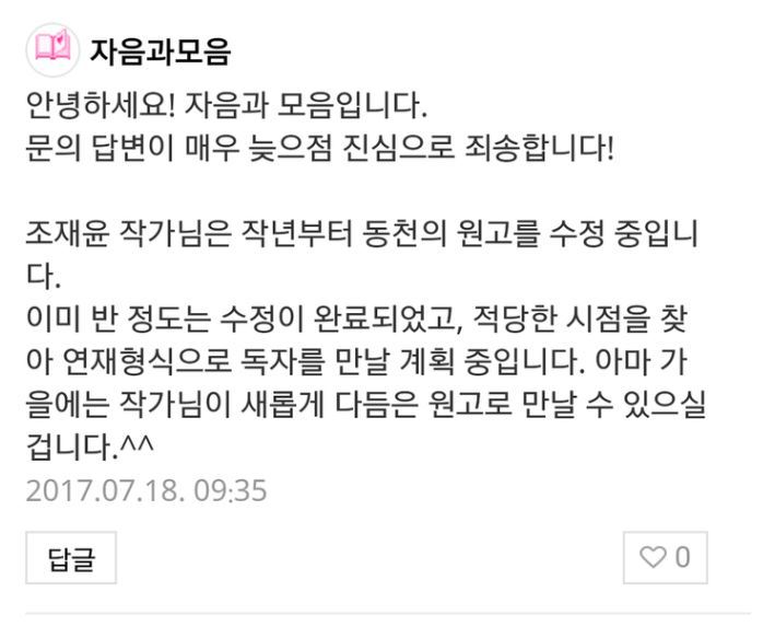 이제 슬슬 운영진으로 소임을 다할 수 있을 것 같아서 다행이라는 생각과 조재윤 작가님의 무사귀환을 진심으로 축하올리는 날이 다가왔으면 좋갰습니다.