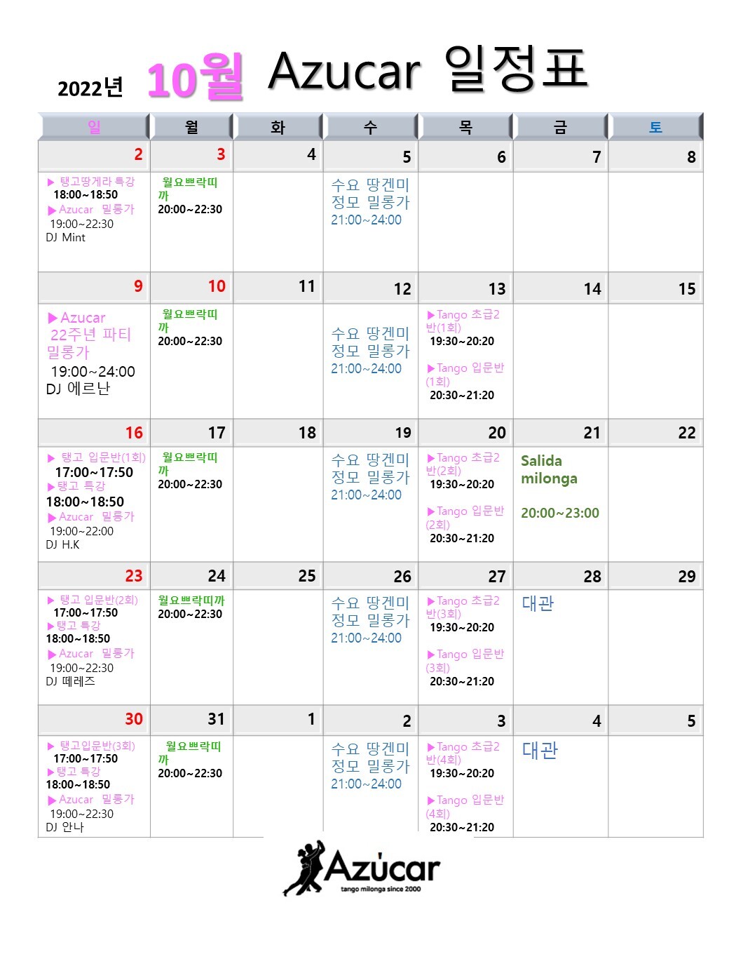 2022년 10월 아수까 일정 안내 작성자라퓨타|작성시간22.10.03|조회수229 목록 댓글 0 글자크기 작게가 글자크기 크게가 하늘이 열리고 22년전 탄생한 아수까의 생일 밀롱가가 있는 10월입니다.새롭게 입문반도 모집할 예정이니 관심있으신 분들의 참여를 부탁드리며청년 아수까의 성장도 축하해주세요~~~ 다음검색 현재 게시글 추가 기능 열기 북마크 공유하기 신고 센터로 신고 댓글 댓글 0 댓글쓰기 답글쓰기 댓글 리스트