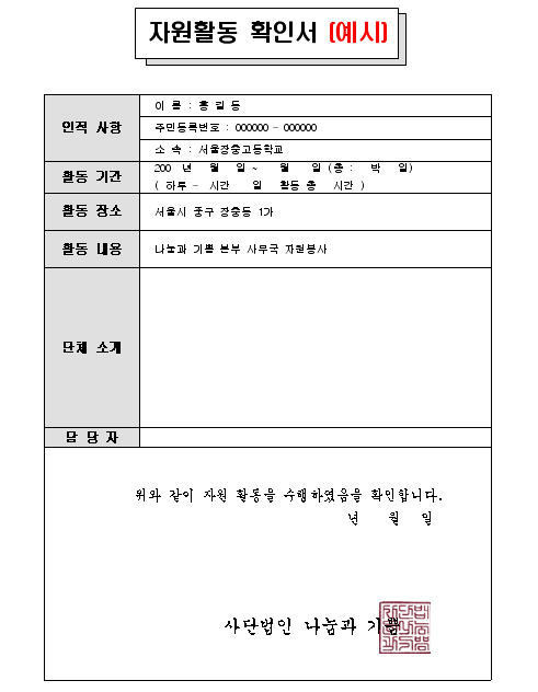 [공동]자원봉사확인증 및 자원활동확인서(예시) 작성자나눔과기쁨부울경|작성시간09.05.04|조회수450 목록 댓글 0 글자크기 작게가 글자크기 크게가 다음검색 현재 게시글 추가 기능 열기 북마크 공유하기 신고 센터로 신고 댓글 댓글 0 댓글쓰기 답글쓰기 댓글 리스트
