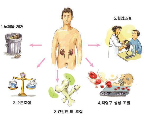 몸 안에 흐르는 노폐물과 수분을 소변을 통해 몸 밖으로 배출시키는 기능도 하고 여러 전해질 농도를 일정하게 유지시켜주며 혈압을 조절하는 등 많은 일을 하고 있습니다.