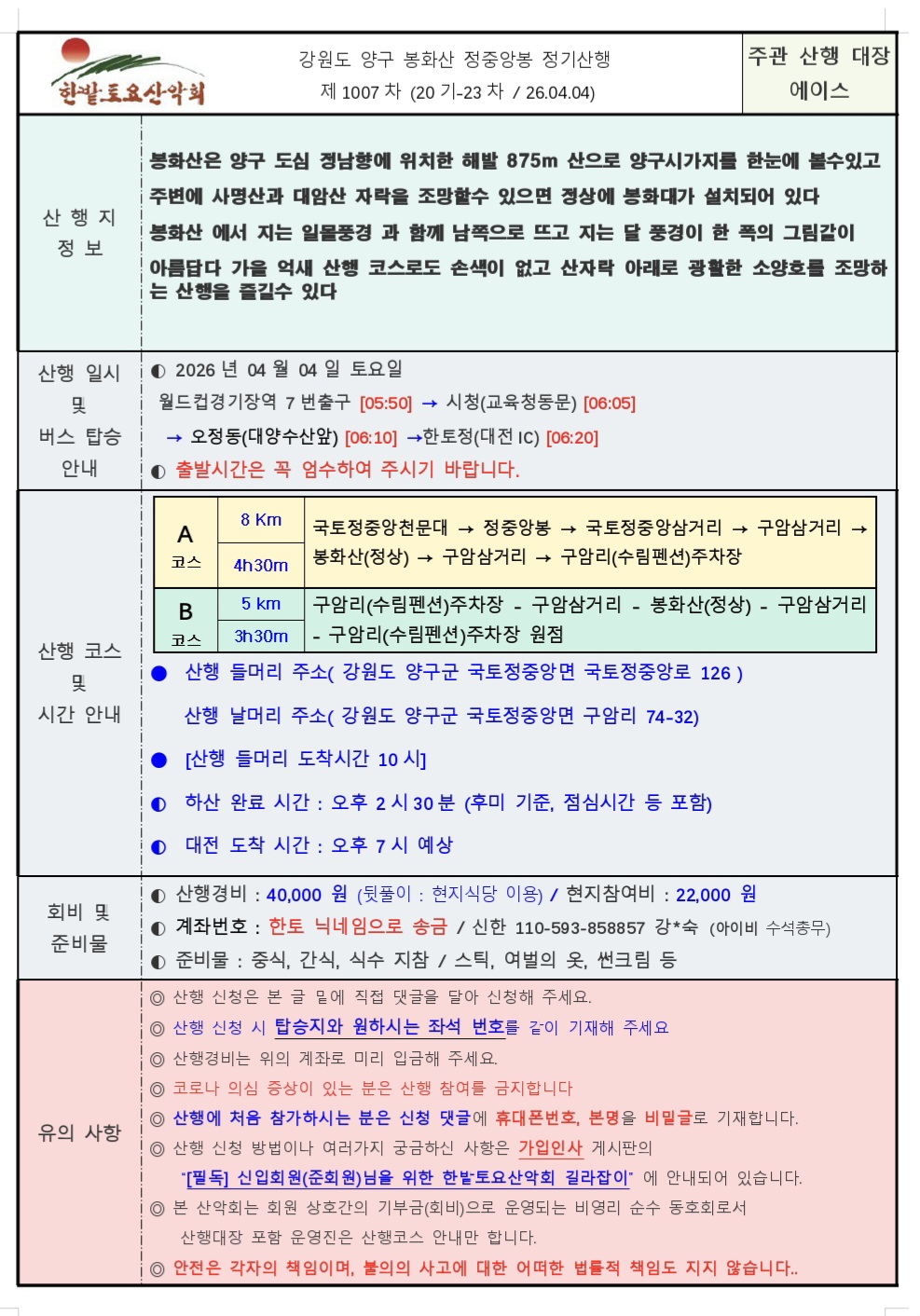 제1007차 (20기 -23차 / 26,04,04) 양구 봉화산, 정중앙봉 정기산행 작성자에이스|작성시간26.03.18|조회수703 목록 댓글 36 글자크기 작게가 글자크기 크게가 다음검색 현재 게시글 추가 기능 열기 북마크 공유하기 신고 센터로 신고 댓글 댓글 36 댓글쓰기 답글쓰기 댓글 리스트 작성자철인 | 작성시간 26.03.30 유성 43 작성자한결같이 | 작성시간 26.03.31 유성 5 작성자사계절 | 작성시간 26.04.02 오정동 35 작성자사손 | 작성시간 26.04.03 시청 32 작성자목이 | 작성시간 26.04.03 탑승지 바꾸시거나 산행 취소하실때 좌석표에 댓글 부탁드립니다 %-5453-9171 댓글 전체보기