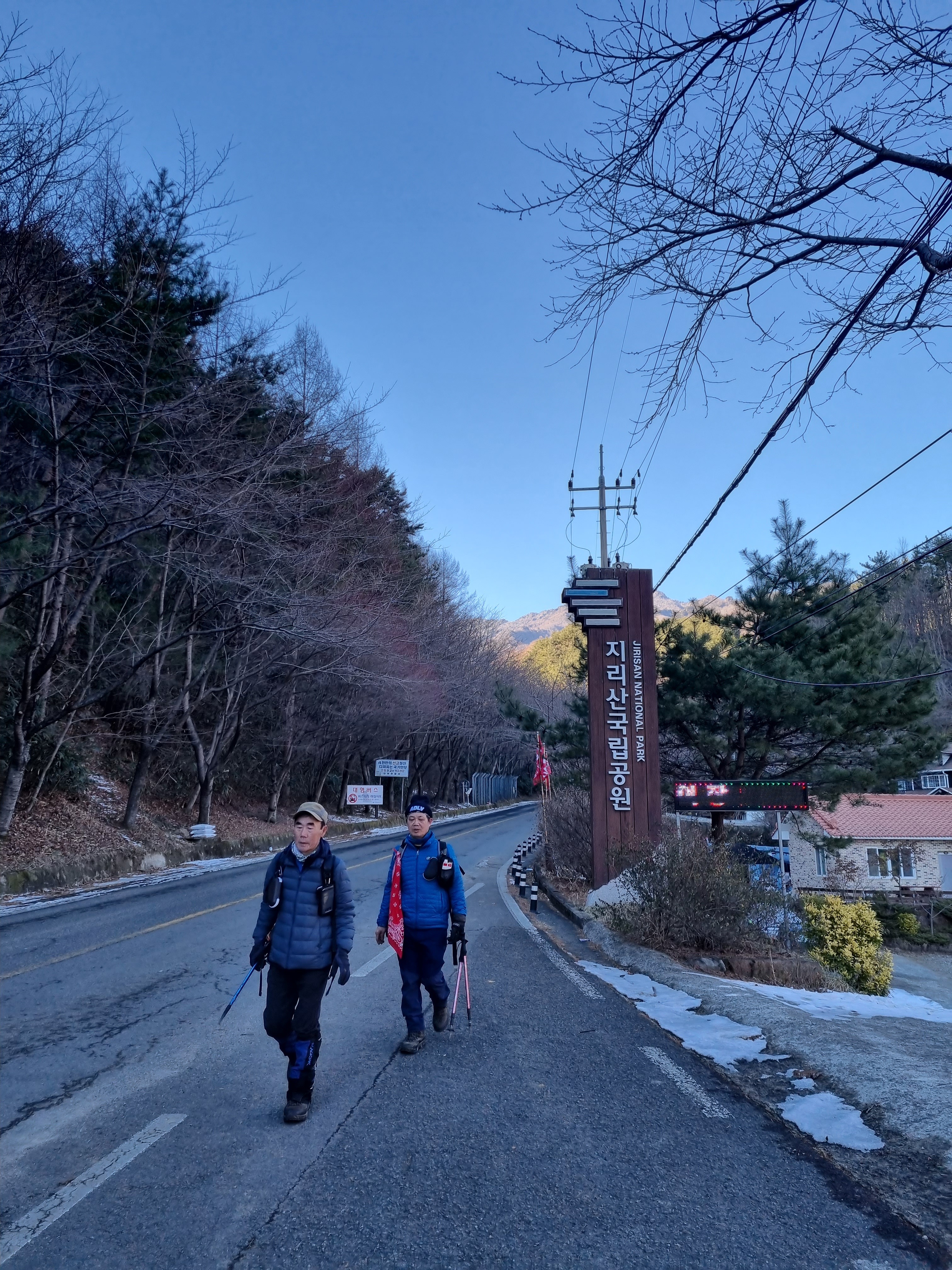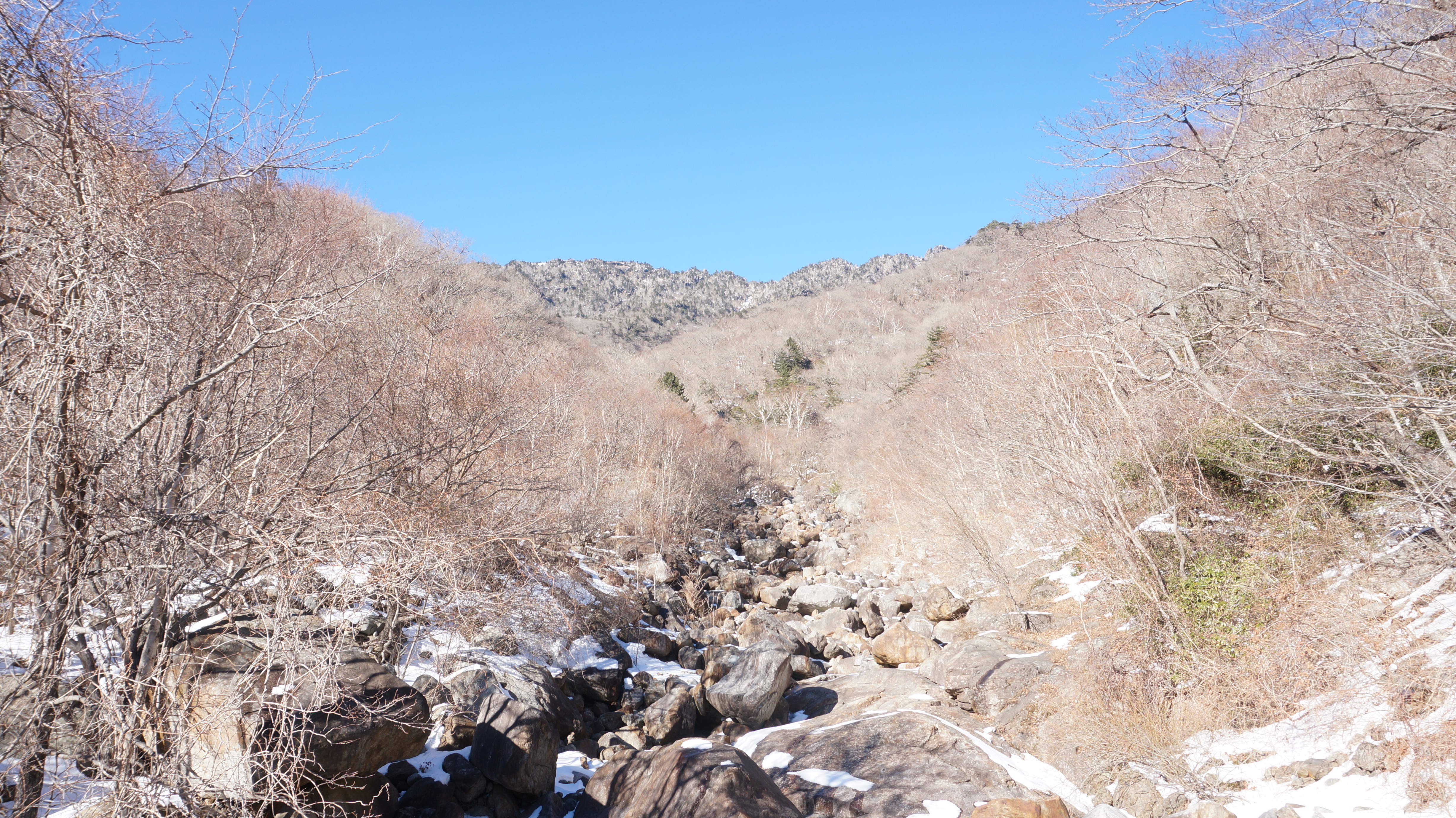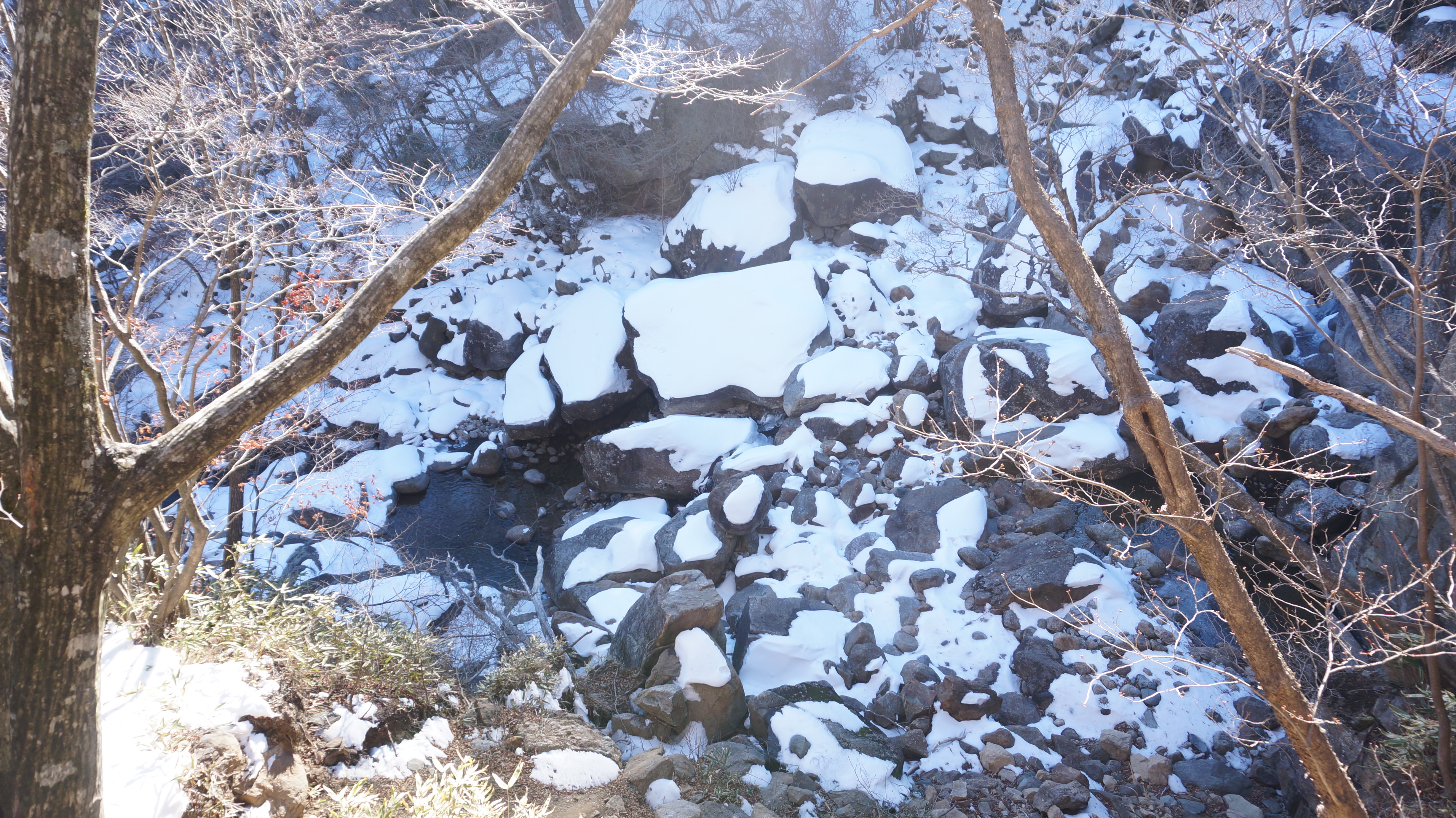 ▲법천계곡을 내려와서 올려다본 장터목산장쪽
