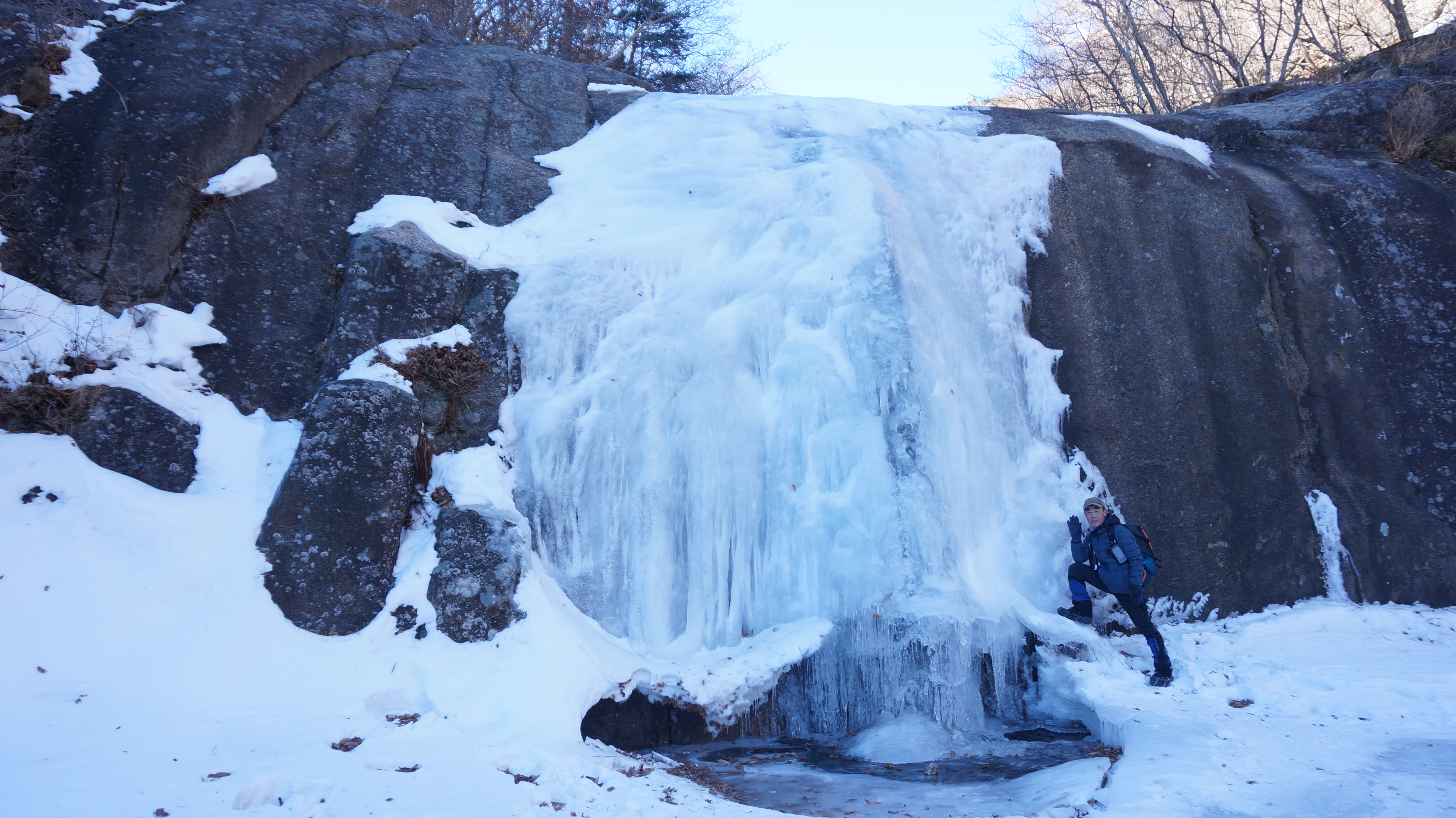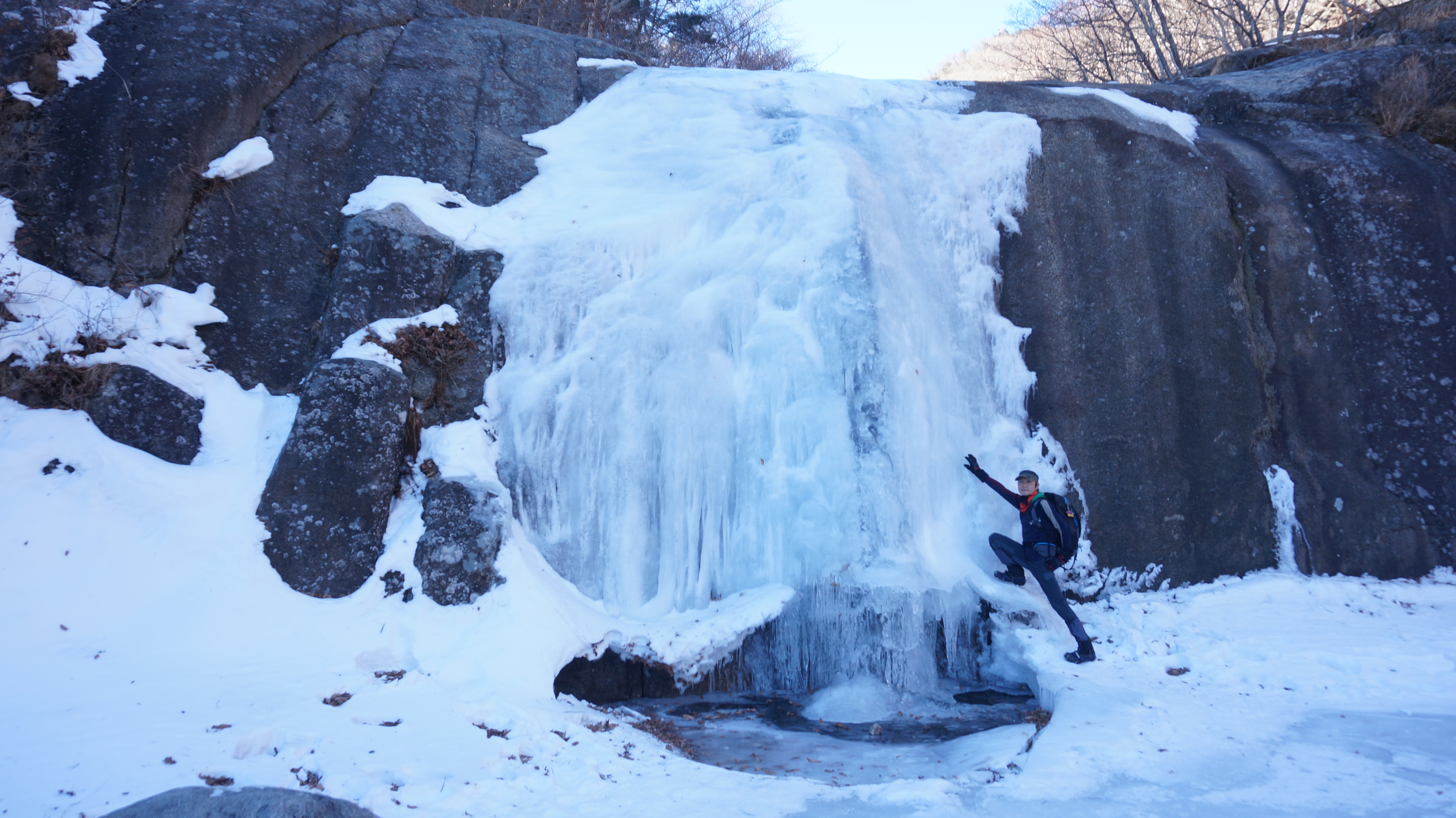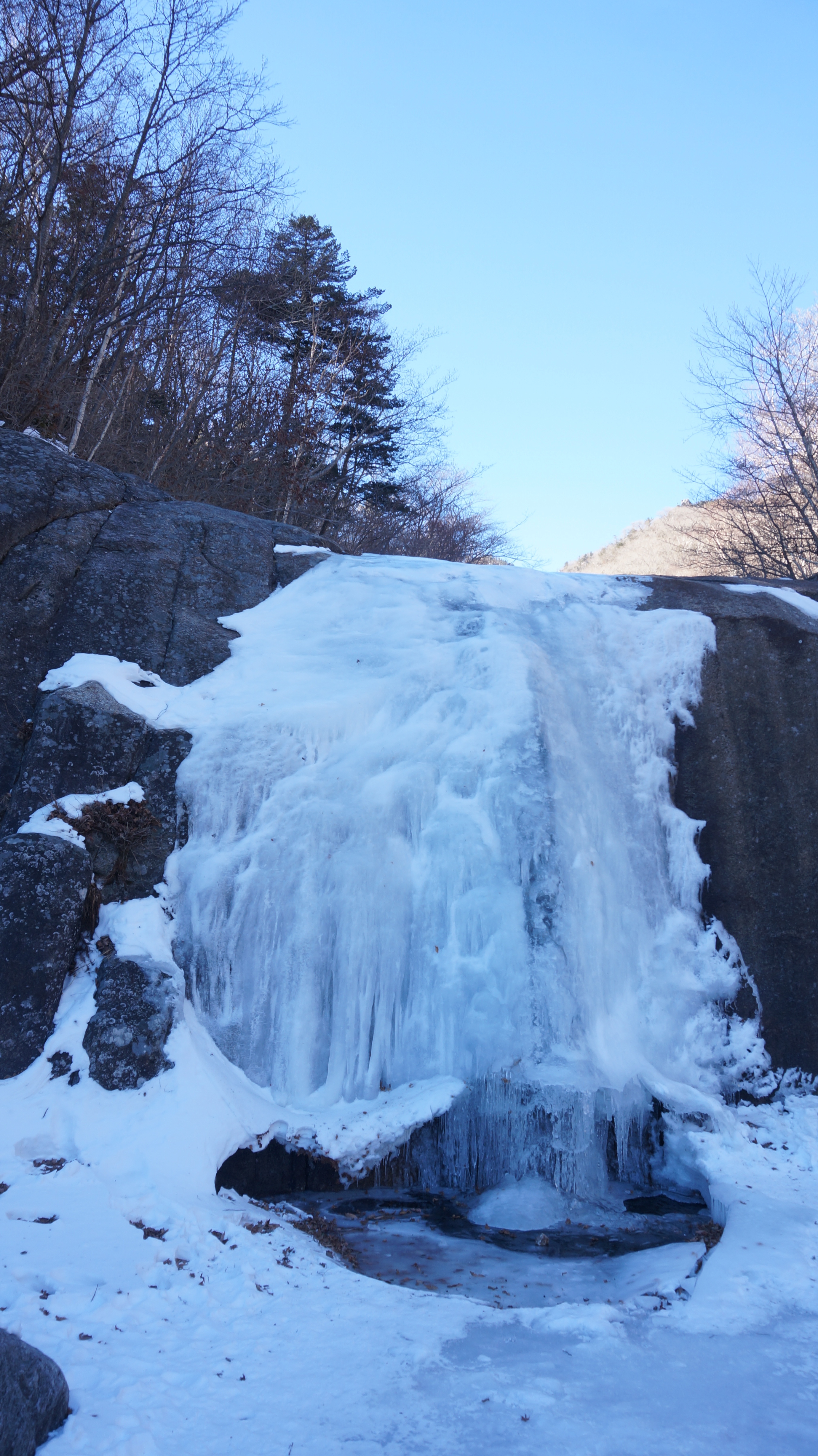▲법천계곡을 내려와서 올려다본 장터목산장쪽