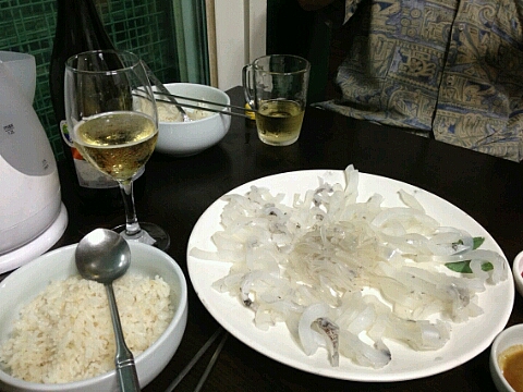 1차로 무늬오징어 회와 화이트와인을 먹었습니다.