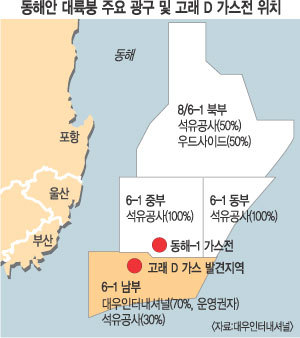 빨강색 동그라미 두 개 중에서 윗쪽 동해-1 가스전이라고 쓰여진 그곳입니다.