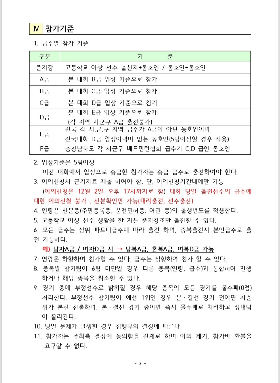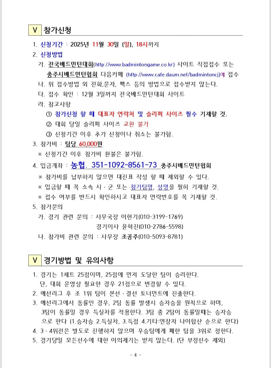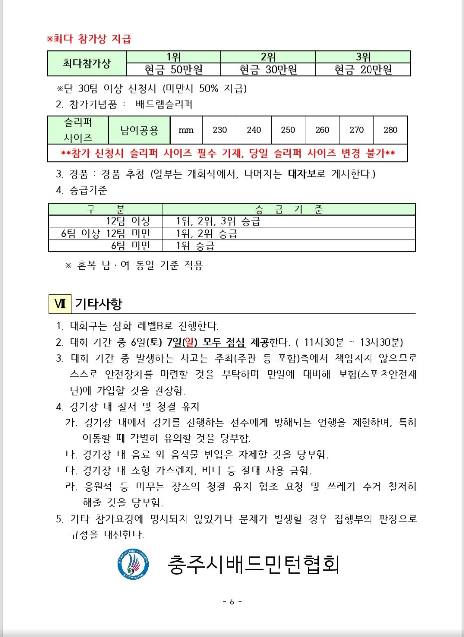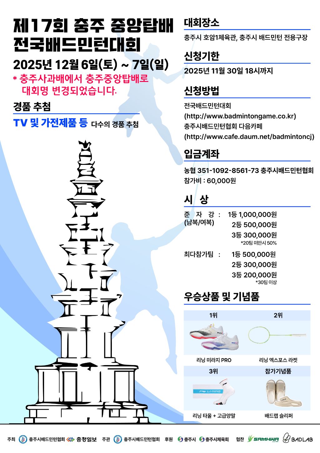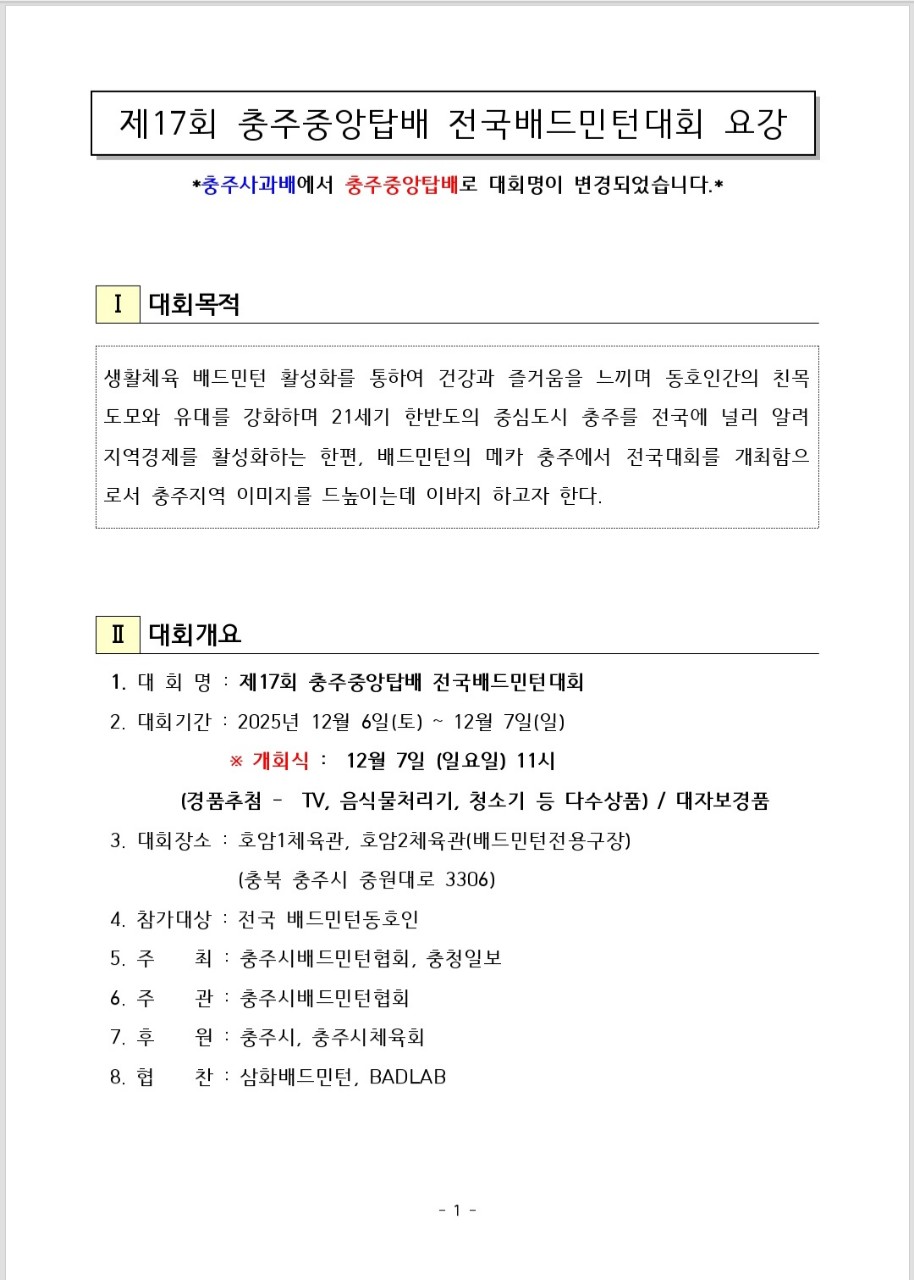 제17회 중앙탑배(구충주사과배) 전국배드민턴대회 요강 작성자오인교(홍보이사)|작성시간25.11.03|조회수655 목록 댓글 0 글자크기 작게가 글자크기 크게가 📣📣제 17회 중앙탑배《구 충주사과배 》 전국배드민턴 대회가 12월 6일(토),7(일)에 열립니다. 동호인님들의 전폭적인 출전과 타 도시 지인분들에게도 출전 권유 부탁드립니다 🍎🍎 다음검색 현재 게시글 추가 기능 열기 북마크 공유하기 신고 센터로 신고 댓글 댓글 0 댓글쓰기 답글쓰기 댓글 리스트