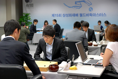 별들의 전쟁. 오랜 시간 중국에 주도권을 내어 줬던 한국이 모처럼 주도권을 잡은 가운데 삼성화재배 16강전이 펼쳐진다. 10월 13일 오전 11시 삼성화재배 월드바둑마스터스 16강전이 유성의 삼성화재연수원에서 시작했다. 이창호-콩지에, 이세돌-야마시타 게이고, 허영호-왕타오, 원성진-저우루이양 판 등 흥미진진한 대진이 가득하다. 사이버오로와 야후바둑에서는 16강전 전판을 수순 중계하며, 이 중 한상훈-구리 대국을 김영삼 8단의 해설로 중계한다. 한상훈 5단은 입단한 지 얼마 안 된 시절이던 2007년, 초단 신분으로 중국 최강이던 구리 9단을 LG배에서 꺾으며 최고의 화제가 된 바 있다. 지금까지 두 기사의 전적은 1-0. 구리 9단에게는 설욕전이며, 한상훈 5단에게는 다시 한 번 자신의 이름을 확인시킬 기회다. ○●..제15회 삼성화재배 16강전 대진 13일 오전 11시 ● 원성진 9단 - ○ 저우루이양 5단(中) ● 최철한 9단 - ○ 박정환 8단 ● 박영훈 9단 - ○ 왕레이 6단 ○ 한상훈 5단 - ○ 구리 9단(中) ● 이창호 9단 - ○ 콩지에 9단(中) ○ 허영호 7단 - ● 왕타오 3단(中) ○ 이세돌 9단 - ● 야마시타 게이고 9단(日) ● 박지연 2단 - ○ 김지석 7단 -----------------------------------------------------------------------------------------------<이하 속보> 오전 - 11시 50분 - 구리의 괴초식! (25수 진행) 구리 9단이 단단히 준비했나보다. 우하귀 날일자 굳힘으로부터 3칸을 고공 점프하는 기괴한 행마를 보여준다. 이에 침착하기로 소문난 한상훈 5단은 깊지 않은 삭감으로 응수한다. 이어서 구리 9단이 모양을 불사하고 나와 끊었다. 다소 과격한 인상인데, 검토실에서는 이런 전투야말로 구리 9단의 전공 과목이라 한상훈 5단이 이 부근에서 조심해야 한다는 이야기가 나오고 있다. 오후 - 12시 10분 - 이세돌, 조치훈 9단 바둑 봤나? 현재 이세돌 9단과 이창호 9단 바둑은 어떻게 되고 있을까. 이세돌 9단과 야마시타 게이고 9단의 바둑은 난전 조짐이 일고 있다. 서로가 좋아하는 스타일이다. 게다가 얼마 전 야마시타 9단이 일본 속기전인 아함동산배에서 조치훈 9단과 둔 바둑과 거의 흡사한 진행을 보이고 있어 이세돌 9단이 의도적으로 이런 진행을 유도하는 것 아닌가 하는 이야기마저 나온다. 이창호 9단과 콩지에 9단 바둑은 평온한 분위기. 그러나 조금이라도 이창호 9단이 편해보인다는 김영삼 8단이 말한다. 한편, 한상훈 5단은 구리 9단에게 너무 실리를 내어 주고 있어 검토실의 우려를 사고 있다. ▲ 한상훈 5단과 구리 9단이 대국 전 숨을 고르고 있다. 오후 - 13시 20분 - 이영구, "이세돌 바둑 절망적?" 검토실에서 이영구 8단이 이세돌 9단 대 야마시타 게이고 9단에 대해 비관적인 견해를 말했다. 현재 형세는 "이세돌 9단이 거의 이기기 어려운 절망적인 상황"이라는 것. 한편, 한상훈 5단과 구리 9단은 대난전으로 돌입했다. 역습을 기대해야 한다. 원성진 9단과 허영호 7단은 매우 우세하다는 이야기가 나오고 있다. ▲ 저우루이양 5단과 차세대 에이스들의 대결을 펼치고 있는 원성진 9단이 우세를 보인다. ▲ 지는 법을 잊은 허영호 7단. 왕타오 3단에 압도적인 바둑을 펼치고 있다. 오후 - 13시 40분 - 한상훈, 우하에서 승부수(90수 진행) 중앙 접전에서는 한상훈 5단이 잘 버텼다는 김영삼 8단의 평이다. 이어서 한상훈 5단이 흑의 우하귀에서 꿈틀거리며 움직이기 시작했다. 여기서 수가 나면 백이 매우 우세해진다. 검토실이 요동친다. 오후 - 13시 50분 - '살 가능성 높지만...' 한상훈(92수 진행) 한상훈 5단이 우하귀에서 수를 내러 온 가운데, 살기만 하면 거의 이기는 장면이다. 그러나 젖힘수(백92)는 불확실해 보인다는 검토실의 견해. 손쉬운 수단이 더 많았을 거라는 이야기들이 돈다. 한상훈 5단의 수읽기를 믿어봐야 하는 상황이다. ▲ 이세돌 9단은 위험하지만 이창호 9단은 중반 이후에도 편안한 형세를 지속하고 있다. ▲ 격전을 벌이고 있는 구리 9단. 작심을 하고 나온 듯하다. 승부의 추는 아직 한쪽으로 기울지 않았다. ▲ 홍일점 박본좌 박지연 2단. 김지석 7단을 맞아 고전하고 있다.오후 - 14시 25분 - 김지석, 박지연에 승리 김지석 7단이 박지연 2단에게 170수 만에 백불계승 했다. 가장 먼저 끝났다. 오후 - 14시 28분 - 한상훈 살다, 우세 잡다(108수 진행) 구리 9단의 공격이 빗나갔다. 한상훈 5단이 우하귀에서 여유 있게 살았다. 사는 수순 전에 하변에서 진행하는 변화는 좀더 득을 보기 위한 것. 이로써 공은 한상훈 5단에게 넘어 갔다. 오후 - 14시 40분 - 이세돌 형세 회복! 이세돌 9단의 형세를 비관했던 이영구 8단이 형세가 반전 됐음을 전했다. 야마시타 게이고의 하변 처리가 좋지 못했음을 틈타 다시 좋은 흐름을 가져왔다는 것. 외려 이세돌 9단이 조금 우세하다는 평도 나온다. ▲ 김지석 7단과 박지연 2단은 기세가 충돌해 대국 속도가 빨랐다. 가장 먼저 판이 끝났다. ▲ 대국 전 박지연 2단의 기보를 놔 봤다는 김지석 7단은 "박 2단이 평소에 중국식을 애용하는 것 같았다. 그런데 나와의 대국에서는 왠일인지 사용하지 않았다"고 했다. ▲ 박정환 8단과 최철한 9단의 한-한전. 박정환 8단이 백으로 166수만에 불계승을 거뒀다. ▲ 박영훈 9단과 왕레이 6단 대국