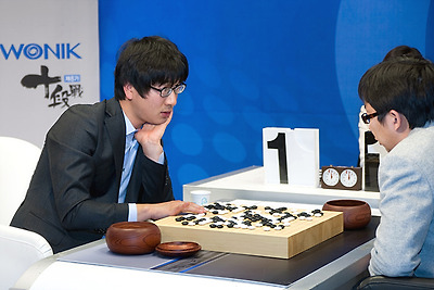 대기실에서 돌을 가렸다. 반상에 흑들을 올려 놓은 박영훈이 돌가리기에서 맞혔다. 그런데 침묵이 흐른다. 박영훈이 머뭇거리자 목진석이 박영훈의 얼굴을 쳐다본다. 그제야 알아차린 박영훈이 “앗차, 맨날 잊어버린다니깐…”이라며 백을 선택했다. 원익배 십단전은 돌 가리기에서 맞힌 쪽이 바로 흑을 갖는 것이 아니라 흑백을 선택할 권리를 가진다. 두 기사 간 백을 잡은 쪽의 승리 확률은 70%를 웃돌 정도로 편중됐고 최근 두 사람의 여섯 경기는 백을 잡은 쪽이 이겼다. 양이(兩李)를 꺾은 두 기사는 초반 착수에 거침이 없었다. 박영훈 9단과 목진석 9단은 24강전에서 각각 이창호 9단과 이세돌 9단을 꺾으면서 올라왔다. 하변과 중앙접전은 모두 목진석이 약간 유리하게 전개됐는데 우변 전투의 여파로 상변 흑진을 박영훈이 뚫으면서 승부의 저울추는 백쪽으로 기울었다. 이후 박영훈은 좌변에서 벌어진 수상전을 유리하게 이끌며 항서를 받아냈다. 5일 밤 서울 성동구 홍익동 바둑TV스튜디오에서 열린 제8기 원익배 십단전 16강전에서 박영훈이 목진석에게 164수 만에 백불계승을 거두면서 첫 8강 진출자가 됐다. 백번의 강세는 여전히 이어졌다. 박영훈은 목진석에게 13승 3패로 상대전적에서도 상당한 차이를 벌리며 앞서고 있다. 제8기 원익배 십단전의 우승상금은 5000만원. 제한시간은 10분에 초읽기 40초 3회다. ![]() ▲ 인터뷰 질문에 답하고 있는 박영훈. 바둑TV짤막인터뷰 - 중반, 우하 방면에 목진석 9단이 가일수했다. 그걸 하지 않았으며 흑이 주도권을 쥐었을 것 같은데…? “사실 저는 수가 나는 것을 모르고 있었다. 복기 때 보니까 목 9단이 가일수 한 곳은 수가 나는 자리였다.” - 오늘 흑백선택권을 가졌을 때 백을 선택한 것은 목 9단과의 대결에서 백번 승률이 좋은 것을 의식한 것인가? “아, 모르고 있었다. 그냥 원래 백을 선호하는 편이라…” - 올해 목표는? “천원전에서 우승해 출발이 기분 좋다. 원익배 십단전에서 8강에 올랐으니 우승할 수 있도록 주력하겠다.” ![]() ▲ 대기실에서 돌을 가리다. ![]() ▲ 이세돌을 꺾고 올라온 목진석의 착수는 기백이 넘쳤다. ![]() ▲ 원익배 십단전 제8기의 캐치프레이즈. ![]() ▲ 박영훈과 목진석. ![]() ▲ 박영훈의 착수 모습. | |||