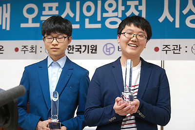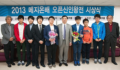 2013년 활짝 피어난 푸른 초목은 변상일 2단이었다. 8일 오후 5시 30분 한국기원 4층에서 열린 2013 동아팜텍배 오픈신인왕전 시상식에서 변상일은 후원사 메지온(최근 사명이 동아팜텍→메지온으로 변경됨)의 박동현 대표이사로부터 우승트로피와 꽃다발 그리고 상금 800만원을 받았다. 이동훈 2단은 준우승트로피, 꽃다발, 상금 300만원을 받았다. 변상일은 지난 3월 28일 바둑TV스튜디오에서 막을 내린 2013 동아팜텍배 오픈신인왕전의 결승에서 한살 아래의 신예 강호 이동훈과 사투를 벌인 끝에 승리하며 신인왕에 등극했다. 생애 첫 타이틀. 변상일과 이동훈은 과거 2009년 제9회 대한생명배 어린이 국수전 결승에서도 마주친 바 있어 입단 전부터 다음 세대 바둑계를 이끌어 갈 재목임을 보여준 바 있다. 이로부터 4년 만에 동아팜텍배 결승에서 재회했을 때 둘은 모두 프로였다. “당시 대한생명배 때는 제가 졌다. 이번 동아팜텍배 결승에서 이동훈 2단과 마주앉았을 땐 마음속으로 침착하자고 다짐을 했는데 막상 대국으로 들어가니 이런저런 생각이 나질 않았다. 그리고 결국 이겼을 땐 정말 짜릿했다”고 변상일은 소감을 말했다. 2013 동아팜텍배 오픈신인왕전은 최고의 신예를 가리는 대회로 동아팜텍이 후원하고 (재)한국기원과 바둑TV가 공동주최했다. 오픈이 의미하는 그대로 아마추어도 참가함으로써 2011년~2013년의 각해 입단자들과 남•여연구생들이 치열하게 대국했다. 하지만 토너먼트 상위단계로 올라갈수록 큰 이변은 없었는데, 마지막에 남은 두 사람은 이ㆍ변이었다. ![]() ▲ 올해 출범한 2013 동아팜텍배 오픈신인왕전의 궤적이 영상으로 흐르고 있다. ![]() ▲ 변상일이 박동현 메지온 대표이사로부터 트로피를 받은 후 악수를 하고 있다. ![]() ▲ 우승·준우승자와 함께. ![]() ▲ 관계자들과 함께. ![]() ▲ 8강멤버들과 찰칵. ![]() ![]() ▲ 신인왕 변상일입니다! | |||