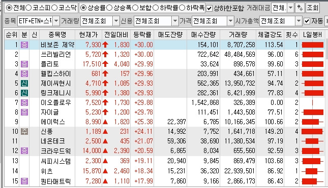 | 비보존 제약 (082800) 7,930원 (+30.00%) | 1 | 트럼프 2기 정부 수혜 전망 속 국산 38호 신약 기대감 지속 등에 상한가 |