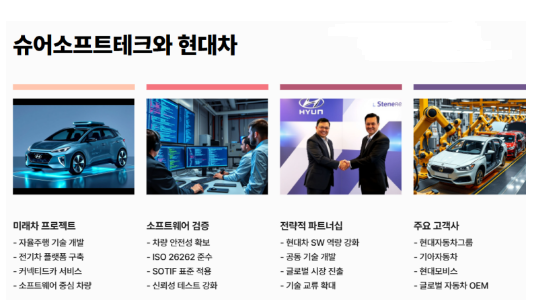 현대자동차그룹에 차량 SW 안전성 관련 검증 툴과 서비스를 제공하며 협력해 왔으며 현대자동차는 슈어소프트테크