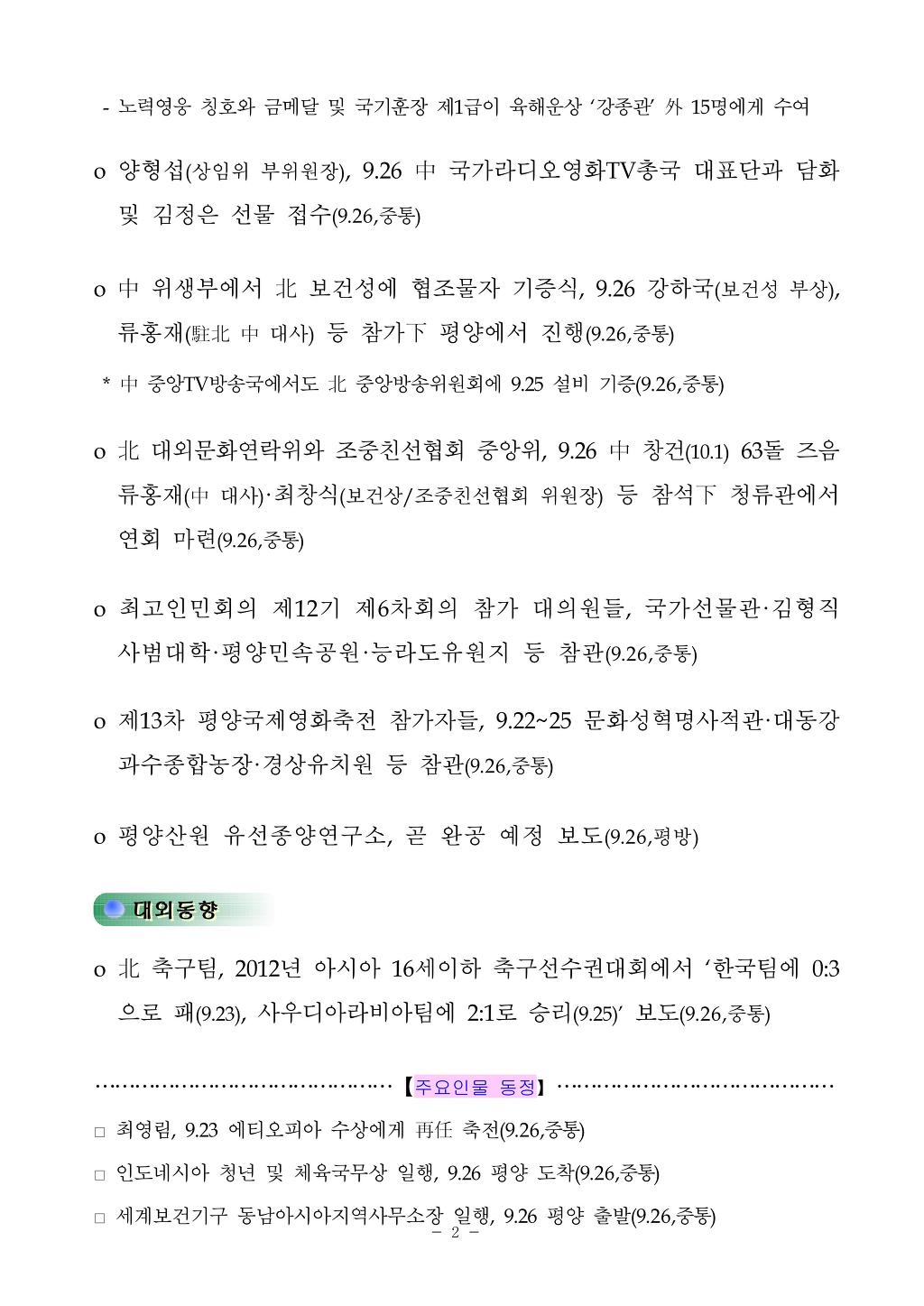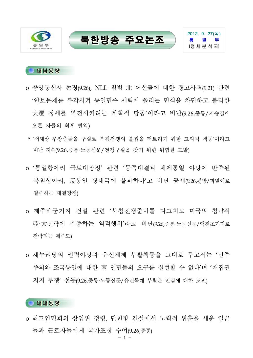 [통일부] 북한 방송 주요 논조 2012년 9월 27일 작성자신들의 황혼|작성시간12.09.28|조회수27 목록 댓글 0 글자크기 작게가 글자크기 크게가 120927.pdf 첨부파일첨부된 파일이 3개 있습니다. jpg 파일 120927_01.jpg 다운로드 jpg 파일 120927_02.jpg 다운로드 pdf 파일 120927.pdf 다운로드 다음검색 현재 게시글 추가 기능 열기 북마크 공유하기 신고 센터로 신고 댓글 댓글 0 댓글쓰기 답글쓰기 댓글 리스트