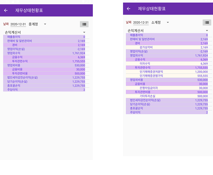 손익계산서의 각 항목은 결산합계잔액시산표의 값을 매핑하고 다음과 같이 계산합니다