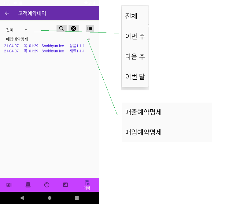 하단메뉴5. 예약내역은 선택된 고객의 예약등록 내역을 보여줍니다.