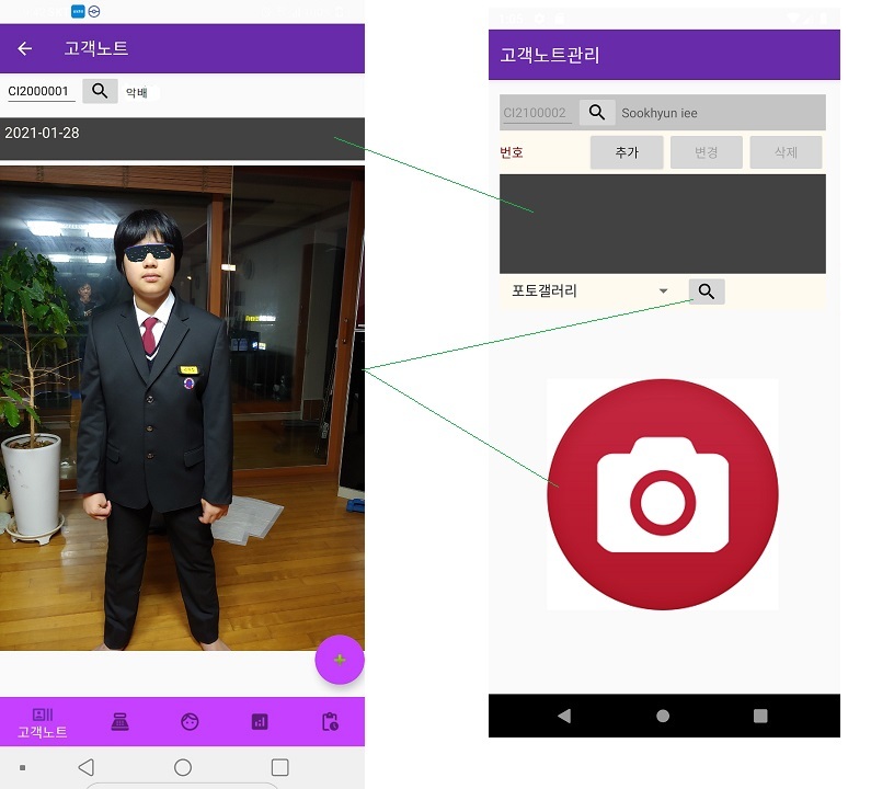 하단메뉴1. 고객노트는 고객관련한 메모와 이미지를 이어서 기록관리 할 수 있습니다.