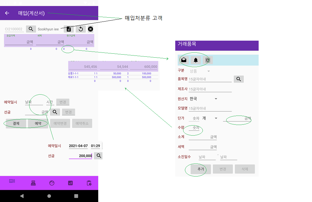 하단메뉴2. 매매내역등록은 선택된 고객이 납품업체 또는 물품제공업체인 경우 매입계산서가 나타나고 그 외는 매출계산서가 나타납니다.