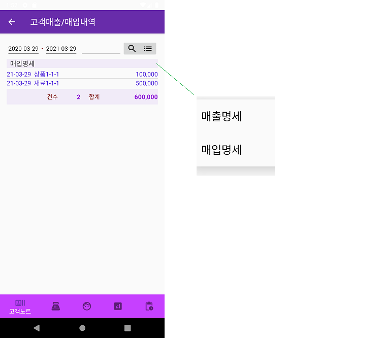 하단메뉴4. 매출/매입내역은 선택된 고객의 매출 또는 매입의 거래내역을 요약해서 보여줍니다.