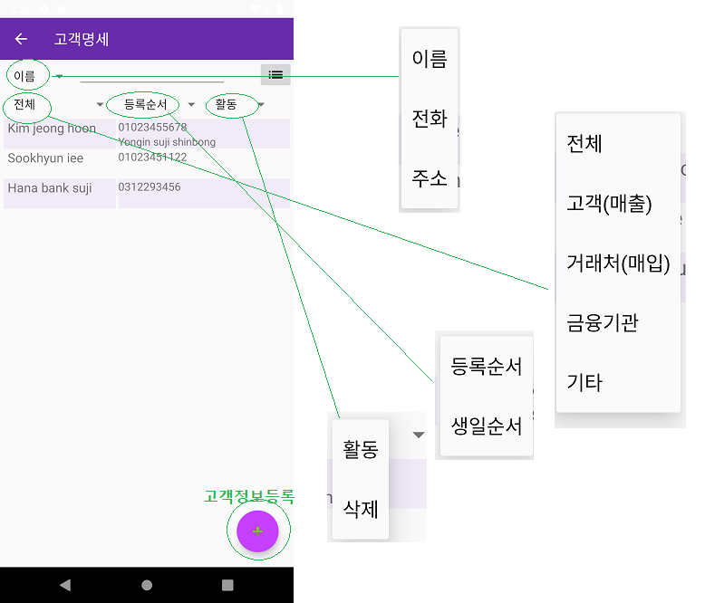 앱 메인화면의 첫번째 아이콘메뉴의 고객정보관리거래를 열면 전체 고객명세를 볼 수 있습니다.