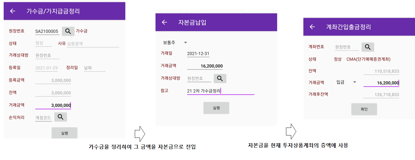 여기서는 주식투자를 더 늘리기 위하여 돈을 가져왔지만 이 돈은 벌어들인 수익과 같이 출처가 명확한 현금이 아니므로 우선 가수금처리하고 필요한 주식을 매입하였습니다. 그 이후 이 돈은 자본금으로 편입시키는 것으로 정리하였습니다.