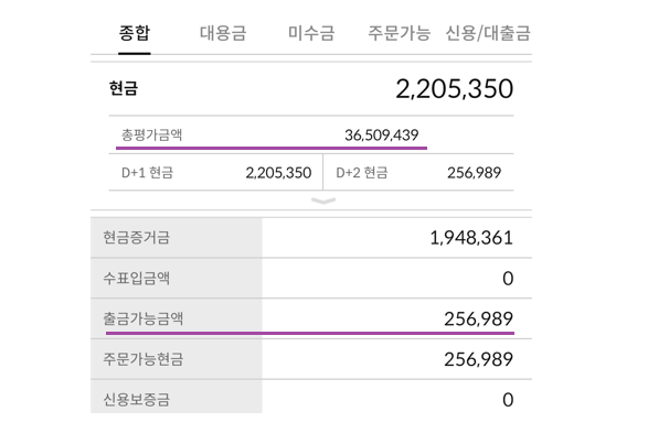 보유중인 주식의 현재 시장가를 잔액으로하고 계좌의 현금잔고를 합하여 현재 계좌의 최종 잔액으로 평가합니다.