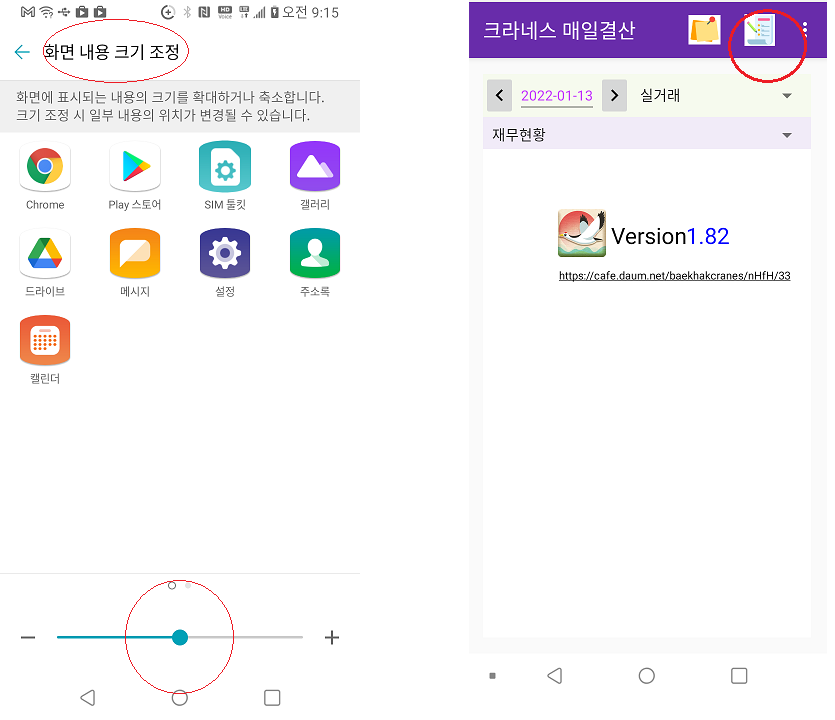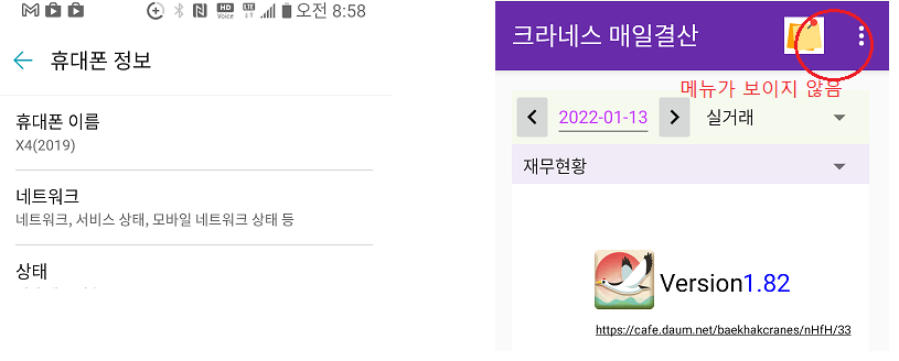 독립적인 다른 회계노트를 갖기 위해 안쓰는 옛날폰에 앱을 설치했는데 해상도가 낮아 메뉴하나가 보이지 않습니다.