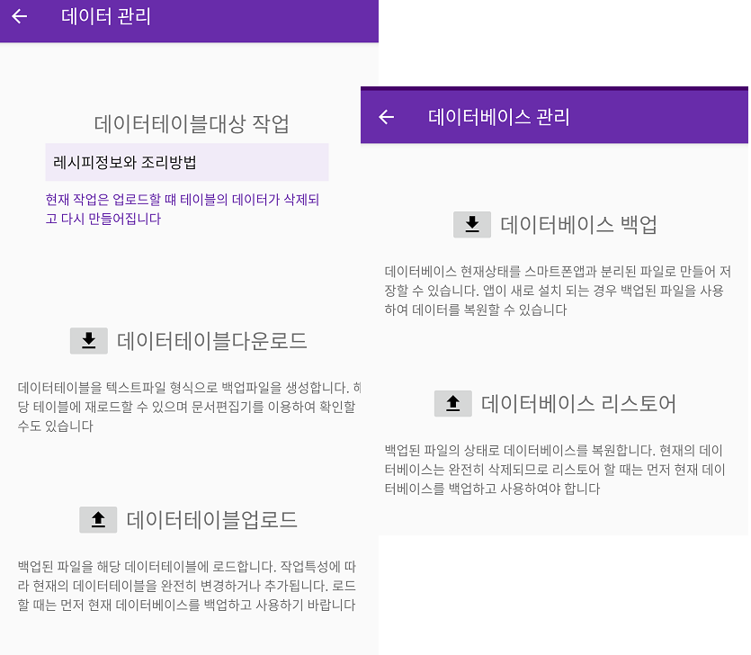 기기가 바꼈을 때 또는 앱을 재설치할 경우를 대비하여, 데이터 전체 또는 중요정보 단위로 다운로드할 수 있습니다.
