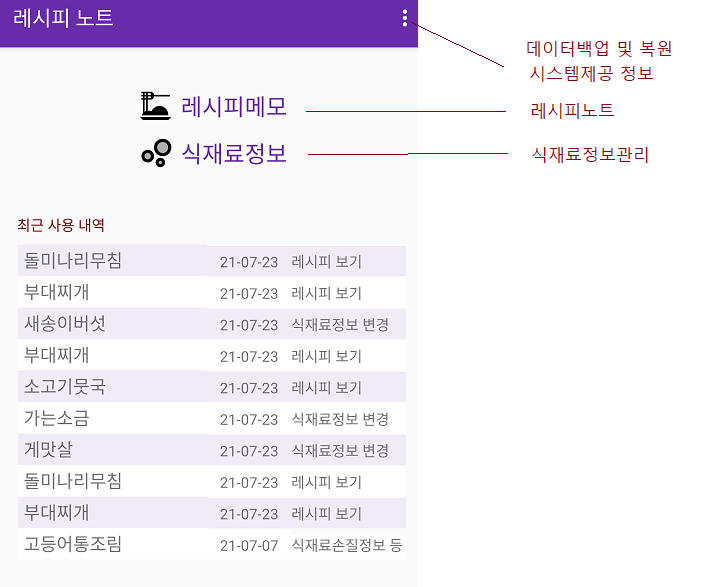 이럴때 필요한 단순히 내가 원하는 레시피만 따로 노트하고 볼 수 있는 그런 용도의 앱입니다.