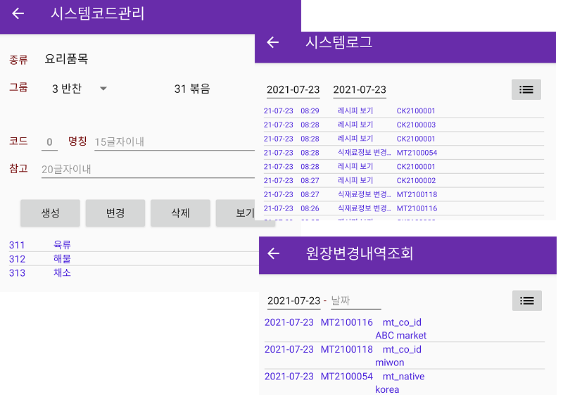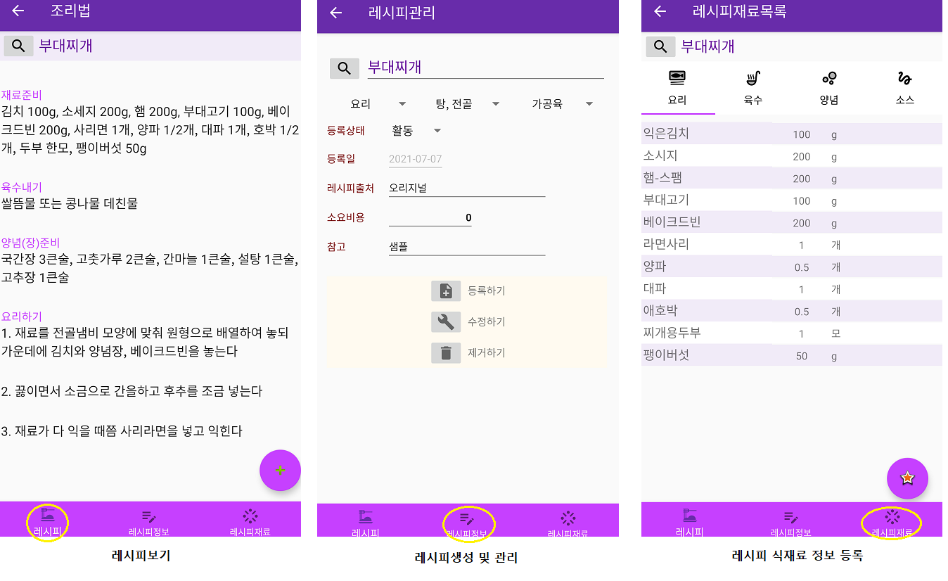 레시피 또는 식재료는 3단계로 분류하여 관리할 수 있고 분류기준도 편리한 데로 다시 정의할 수 있습니다
