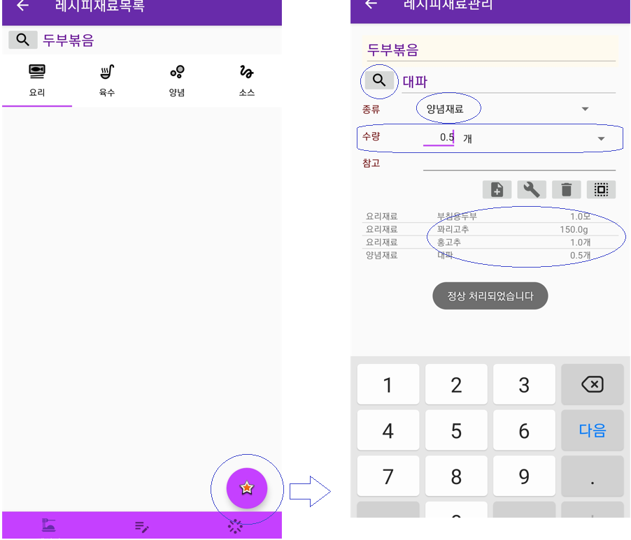 별버튼으로 레시피재료관리화면이 진행됩니다.
