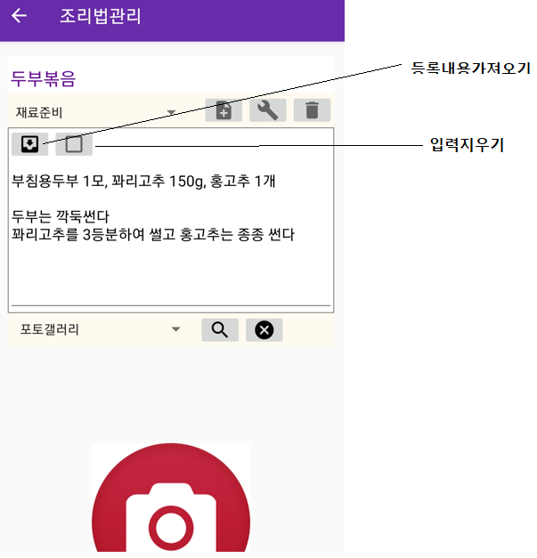 수정이나 삭제는 레시피 내용보기에서 대상을 선택해서 처리합니다.