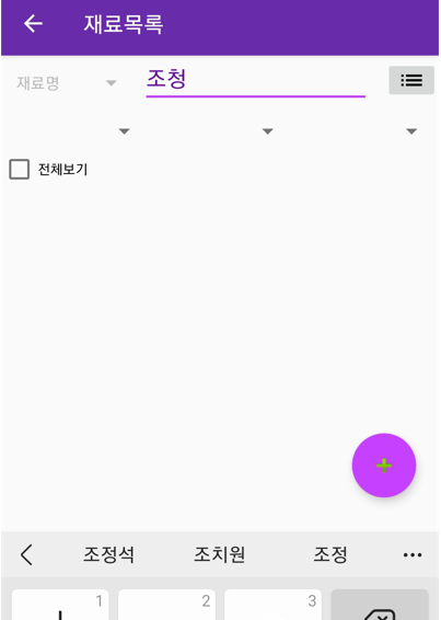 재료명의 일부를 입력하고 또는 추가로 재료종류 정보를 선택하고 리스트버튼을 터치하면 조건에 맞는 리스트를 볼 수 있습니다.