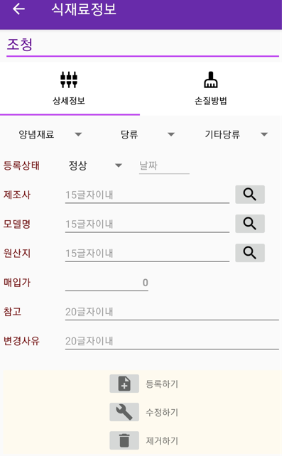 필요하다면 추가로 상세정보를 등록할 수 있고 식재료를 손질하는 방법과 사진등을 등록하는 손질방법은