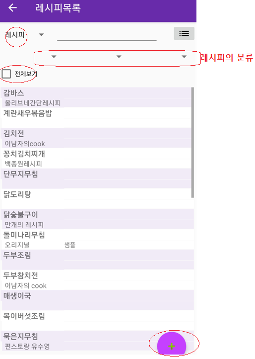 레시피이름 또는 출처의 등록된 단어로 찾아보기 할 수 있고, 레시피 등록할 때 그 레시피의 분류로 지정한 항목으로 찾아 볼 수 있습니다.
